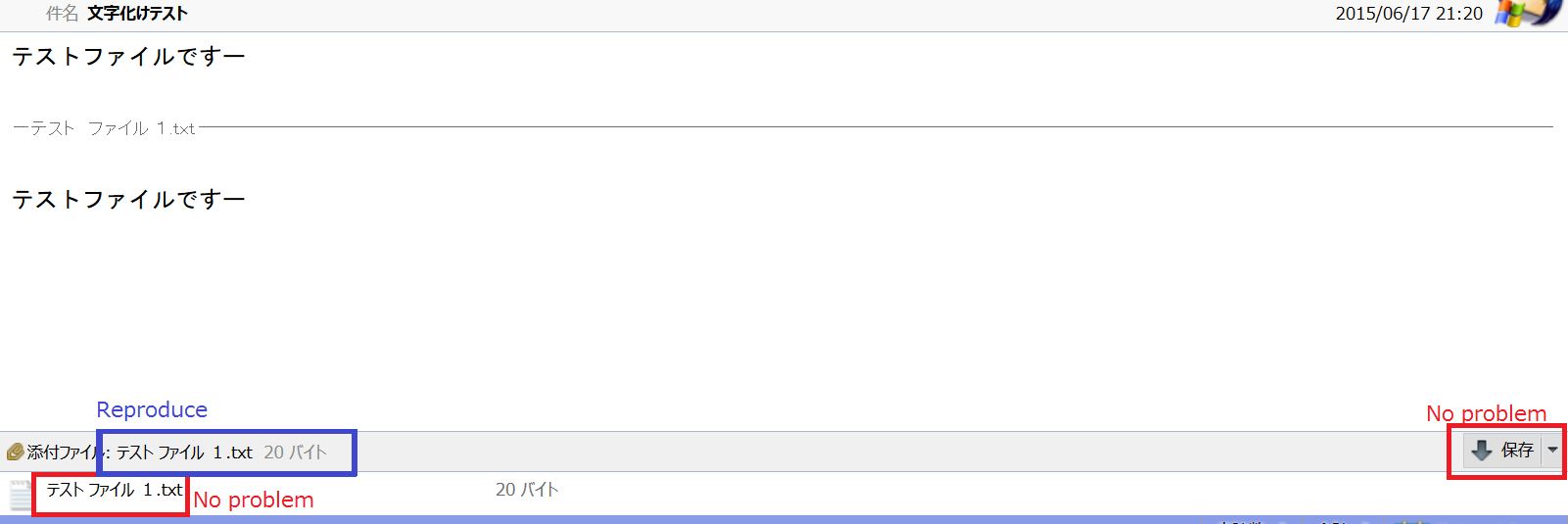 添付ファイルを保存する時に、添付画像の赤枠(「保存」のボタン)を押して保存する場合は文字化けが起きず、正常に保存されます。