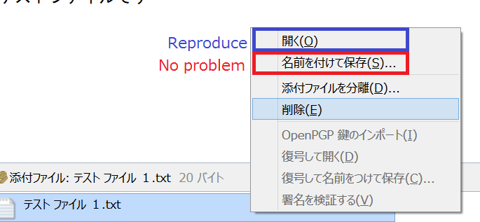 最下部の添付ファイル名から「名前を付けて保存」を選ぶと問題が出ないことは把握済みだったのですが、「開く」の方は試していなかったのと、最初の添付画像ではトリミングで切り落としてしまっていたために報告が漏れていました。