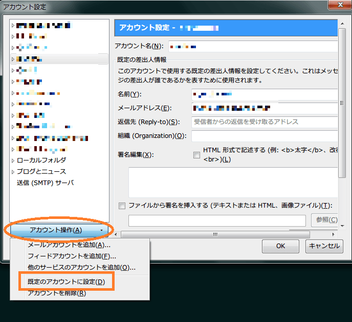 アカウント設定ウィンドウで、左側にあるアカウントをそれぞれ選択した状態で、最