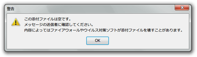 0 バイトの添付ファイルを開こうとすると、次の警告が出ます。