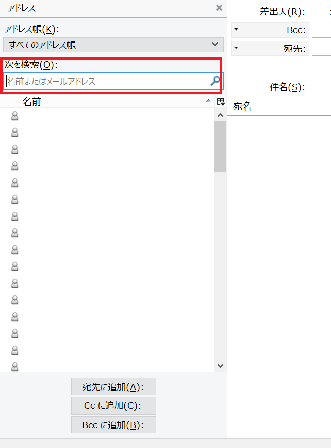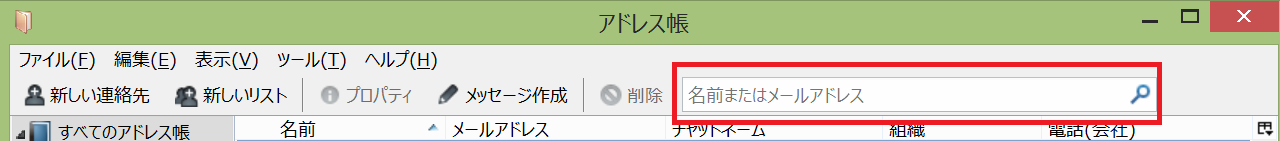 メール作成画面の中でアドレス帳を表示した場合(左側にアドレス帳を表示)も、やはり検索用のフォームがあるはずなのですが、こちらが表示されていないということでしょうか?