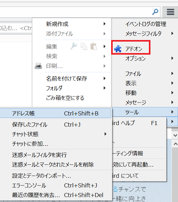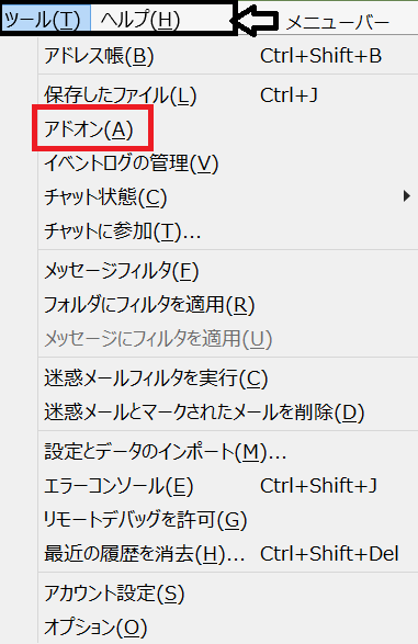 - Mozilla Thunderbird の [ツール] メニューから [アドオン] を選択してアドオンタブを開きます。