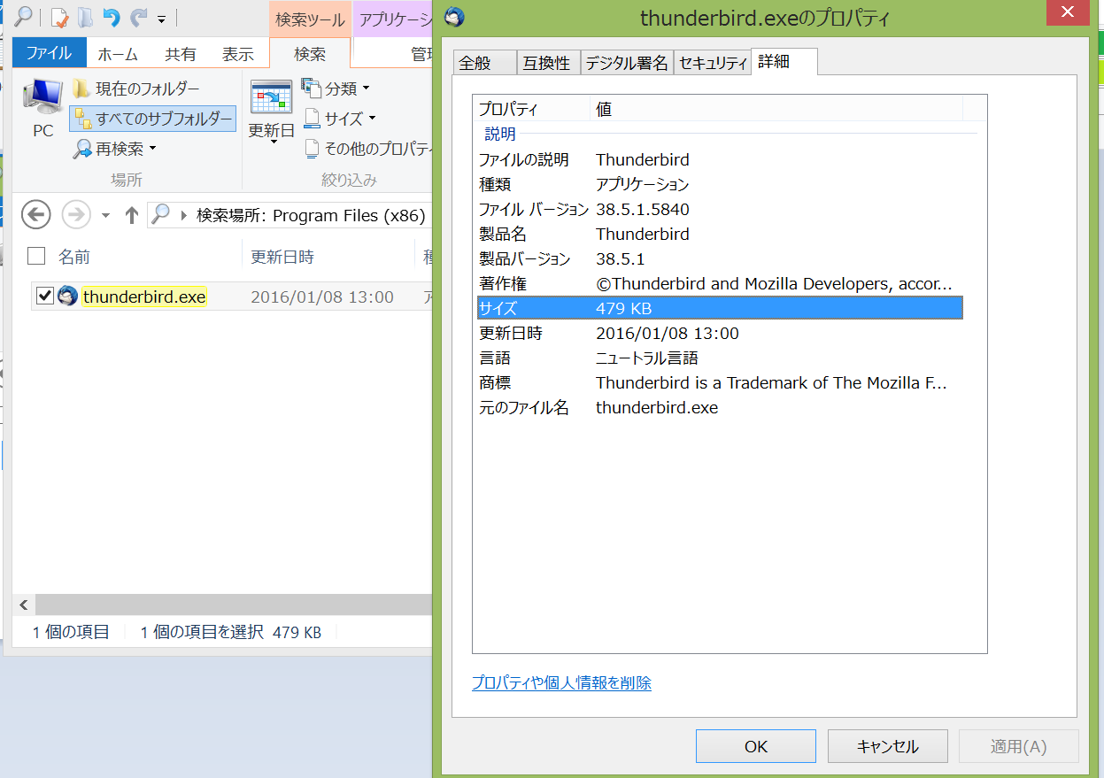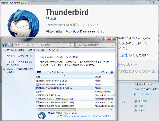 確かに「プログラムのアンインストールまたは変更」の中には38.5.0と38.5.1の両方がありますが、肝心のインストールフォルダ(規定ではC:\Program Files (x86)\Mozilla Thunderbird)内のThunderbird.exeは1つのみで、バージョンは38.5.1ですね。(添付画像参照)