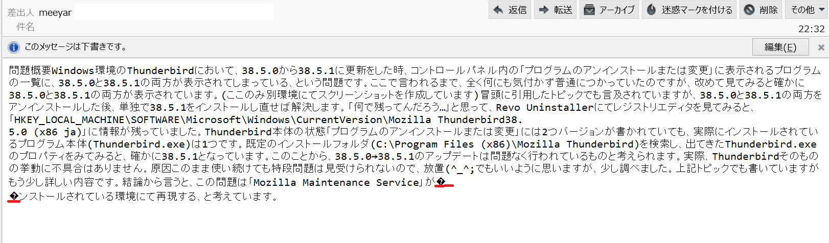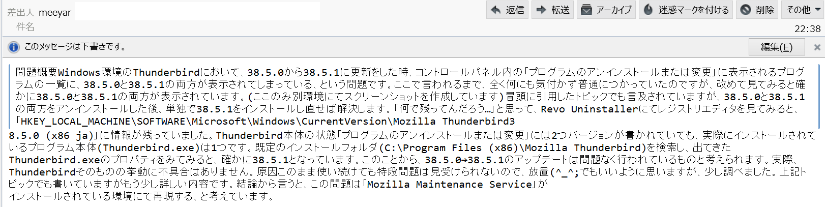 ここまでのお話から考えると、Thunderbird のバグのような気がしますが、具体的なところまではわかりません。