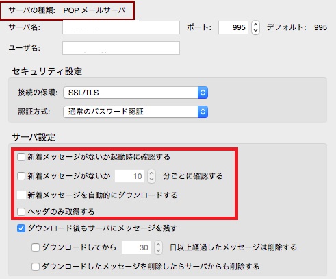 コメント: 赤枠内の項目にチェックを入れない/「ダウンロード後もサーバにメッセージを残す」にチェックを入れる