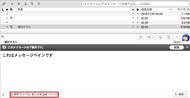 送 信前のメールについてThunderbird上で添付ファイルを開く場合、メール作成画面上から直接開く方法と、「下書き」フォルダ内を開いて画面下部の アタッチメントバーより開く方法がありますが(画像参照)、どちらで行っていますか?