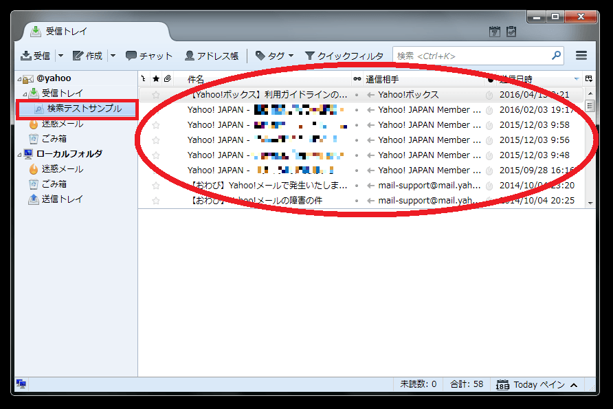 単純に差出人名で検索し、「検索テストサンプル」という名前で検索フォルダを作成する