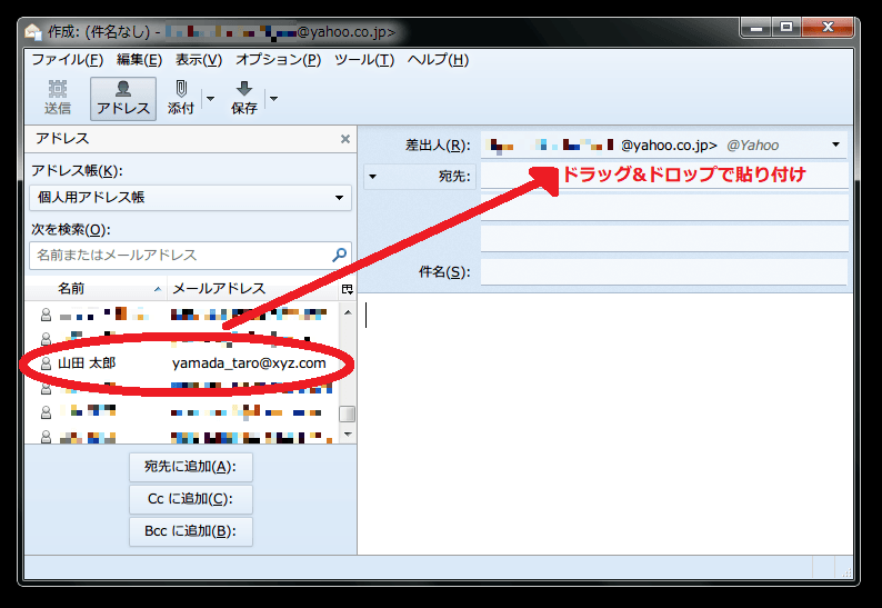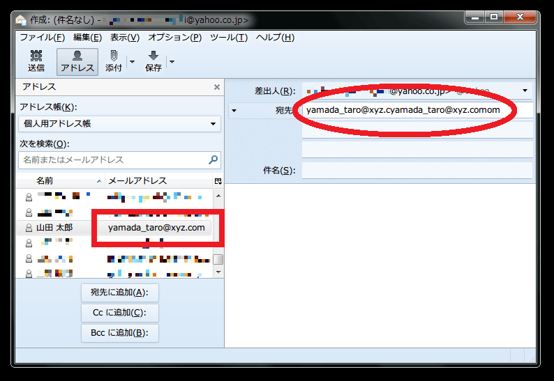 メッセージ作成ウィンドウのアドレスサイドバーから、このアドレスをドラッグ&ドロップで、入力用のキャレットが表示された [宛先] 欄(背景色が標準で白に分かっている)に入れた場合、次のような症状が出ます。
