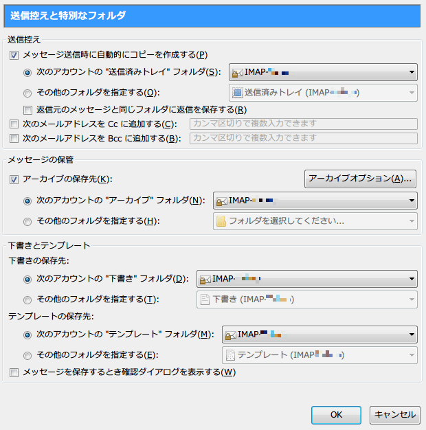 以上から Thunderbird 側では、サーバ側の「送信済みメッセージ」フォルダや「下書き」