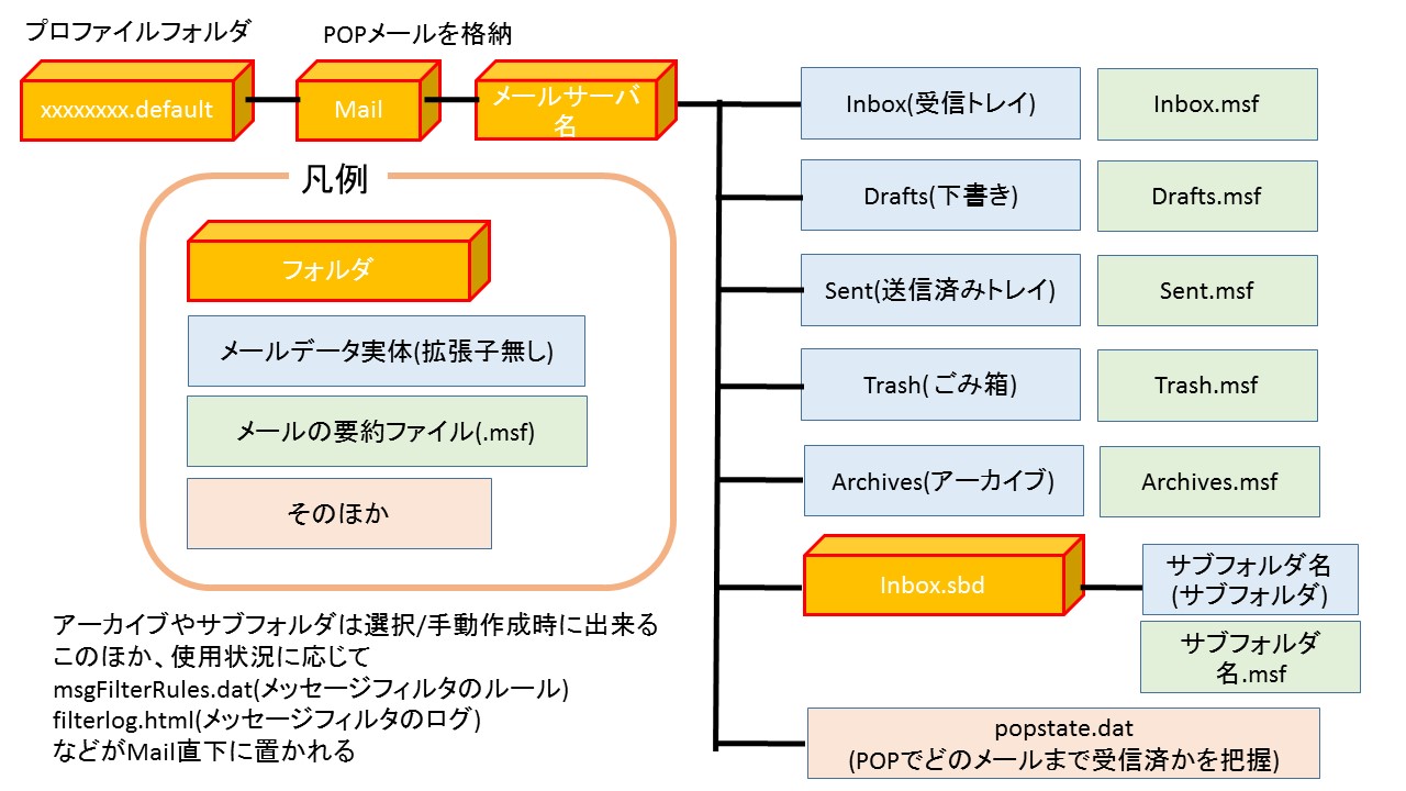 - 受信トレイ:プロファイルフォルダ>Mail>メールサーバ名(またはLocal folders)>内のInbox(拡張子無し)