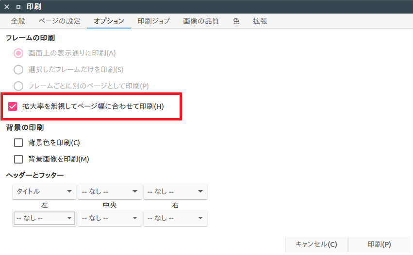 要するに「用紙に合わせて縮小」以外を選択すれば、「拡大率を無視してページ幅に合わせてプリント」のチェックマークは外れます。