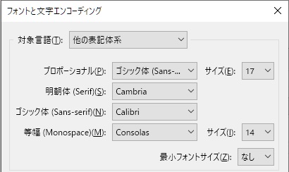 「他の表記体系」のフォント設定を確認してみたところ、添付画像の通りでした。