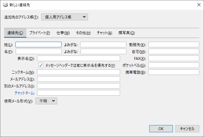 末尾に私の手元の アドレス帳/新しい連絡先 の画面を添付します。