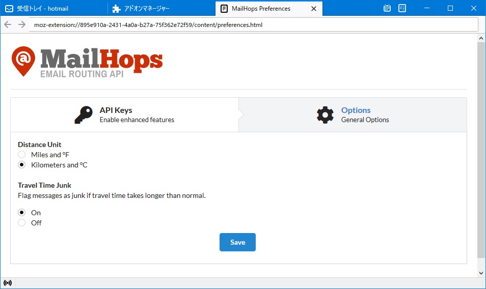 Thunderbird 68用の MailHops 3.8.1 はレガシーアドオンで、オプション設定も別ダイアログを開くタイプです。