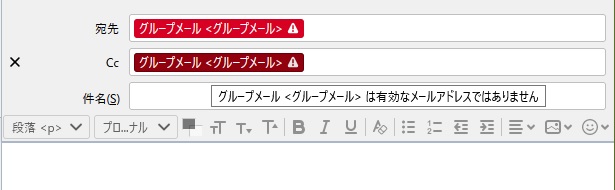 先日突然に、アドレスサイドバーのグループメールアドレスを宛先に追加すると、追加されたグループメールアドレスは赤く表示され、しかも末尾にびっくりマークが付くようになりました。