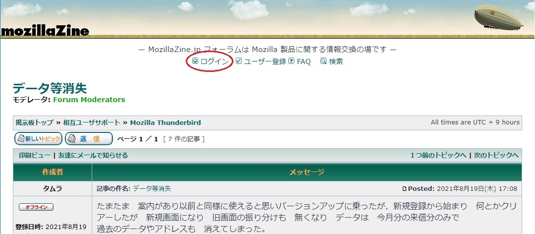 viewtopic.php?f=3&t=18652#p68879 では、ユーザー登録をされた上で「タムラ」でログインされた状態です。