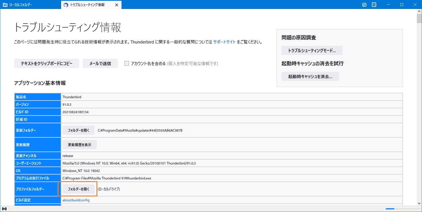 Thunderbird でヘルプ>トラブルシューティング情報>アプリケーション基本情報の