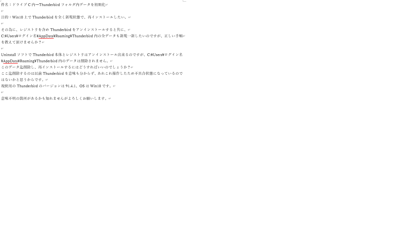 ここ迄削除するのは以前 Thunderbird を意味も分からず、あれこれ操作したため不具合状態になっているのではないかと思うからです。