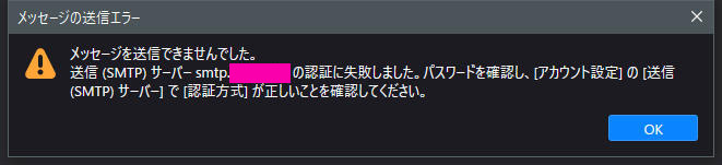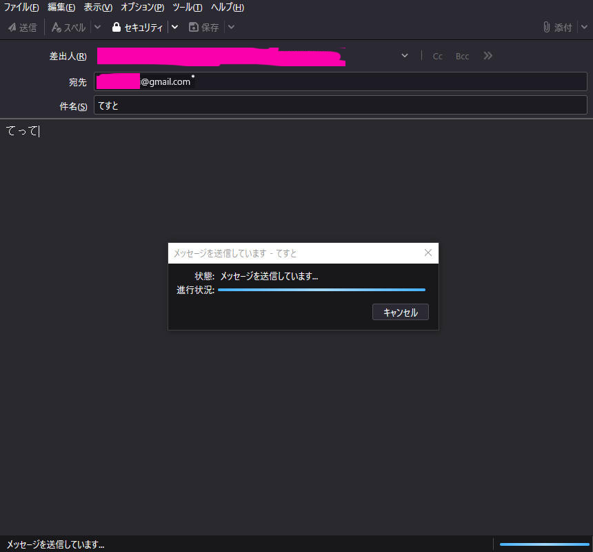 20文字程度でメール送信テストをすると、ここでもパスワードを要求がでて同じことをしましたが送信がいつまで経っても終わらなかったです(キャンセルしました)。