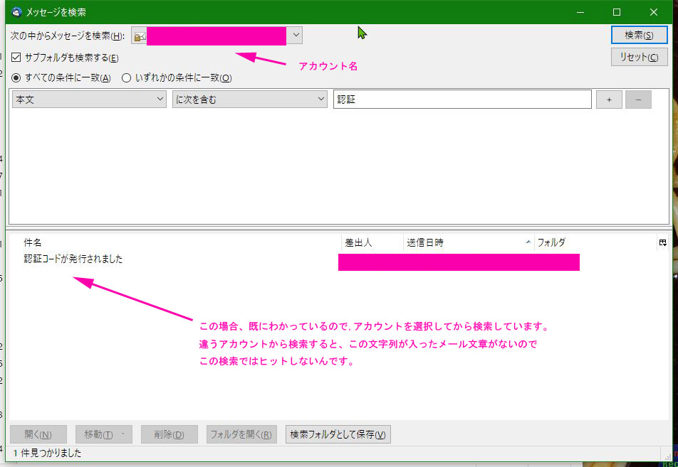 試験的に、全メール検索をしてみたら、アカウントをまたいで結果がでて