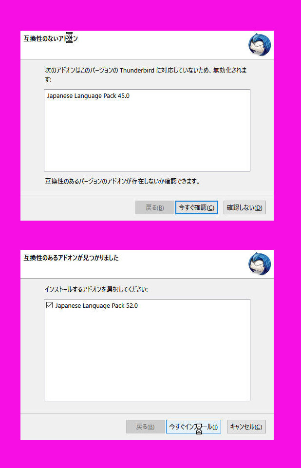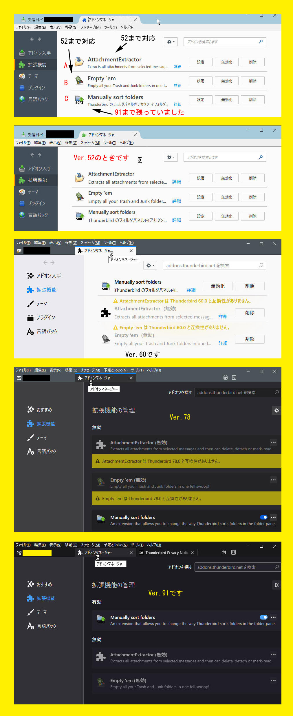 3:はい、1つのアドオンは91まで利用可能でした。各アカウントの受送信、アカウントの設定やフィルタの設定も45環境のままで引き継いでいます。