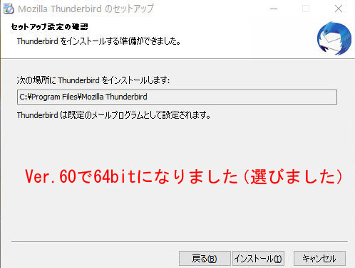 32bit版から64bit版への変換点は、60からでした(Thunderbirdのダウングレードのダウンロード先に、45はPCに残していたので、それ以降の52は32bit版のみで、そして60は64bit版があったので64bit版を選択しました。以降78,91も64bit版でバージョンアップしていきました。
