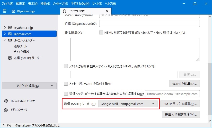 Thunderbird でメールアカウントのセットアップをする際、受信サーバーと送信サーバーの両方を設定しますが、実は送信サーバーの設定は別に管理され、自由に選択して使うことができるようになっています。