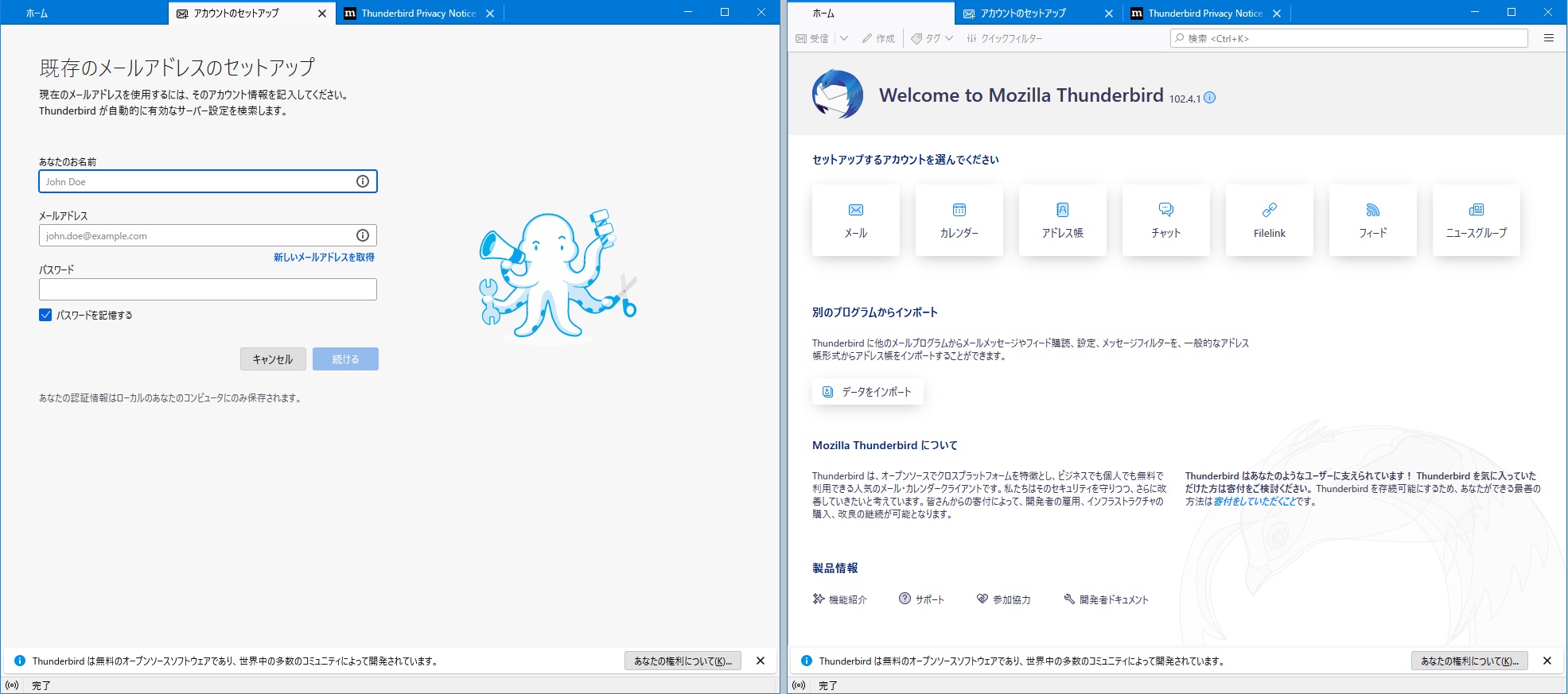 (1) Thunderbirdを起動すると「既存のメールアドレスのセットアップ画面」になった。