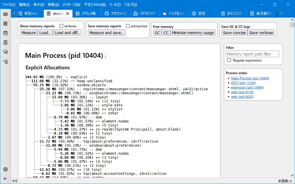 │ ├──15.49 MB (01.51%) -- top(chrome://messenger/content/messenger.xhtml, id=5)/active
