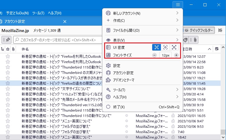設定メニューからフォントサイズを変更したり、したのですが、左側のフォルダ名のサイズは変わるものの、メッセージリストのフォントサイズは変わらないのです。