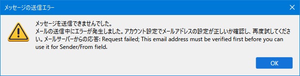 メールの送信中にエラーが発生しました。アカウント設定でメールアドレスの設定が正しいか確認し、再度試してください。メールサーバーからの応答: Bad sender address syntax