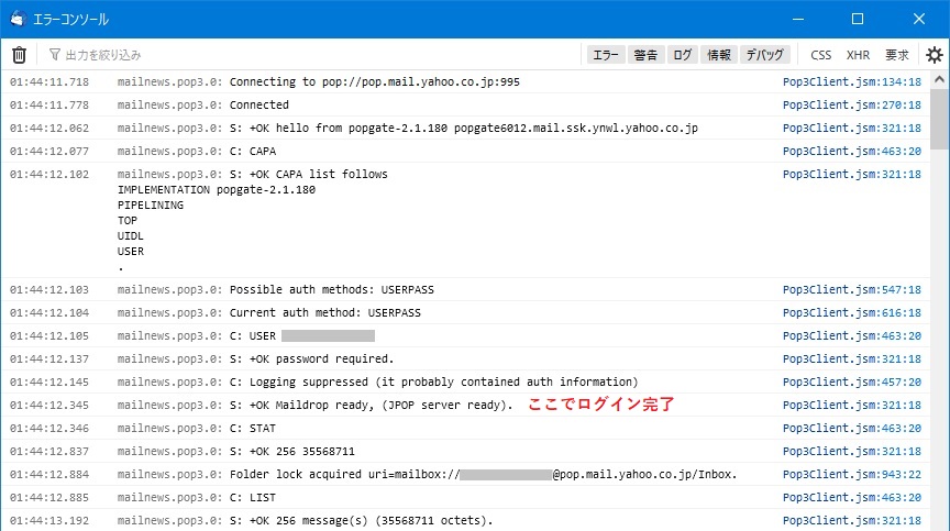 これでPOP処理のログが、ツール>開発ツール>エラーコンソールに出力されるようになります。