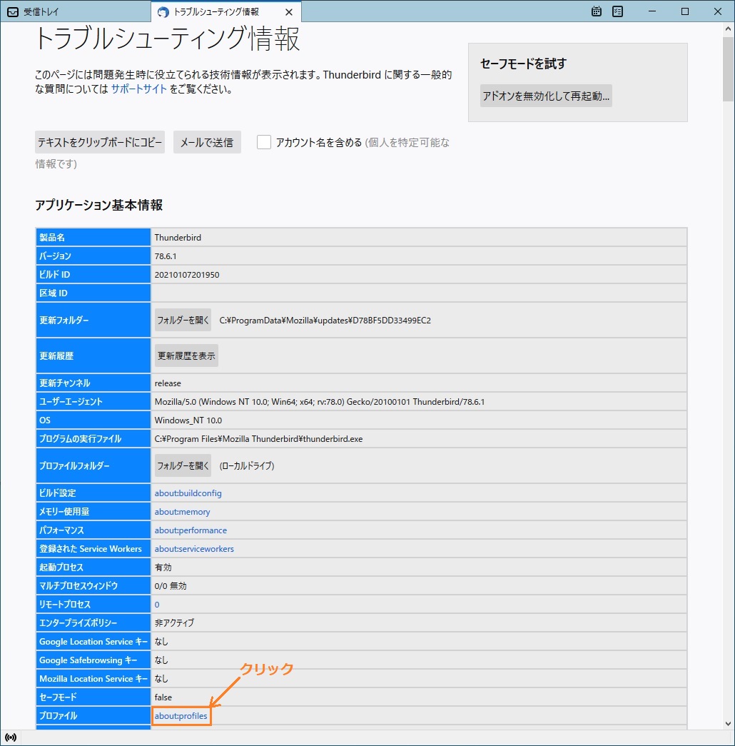 - アプリケーション基本情報>プロファイルの「about:profiles」リンクをクリックしますと、「プロファイルについて」ページが開きます。