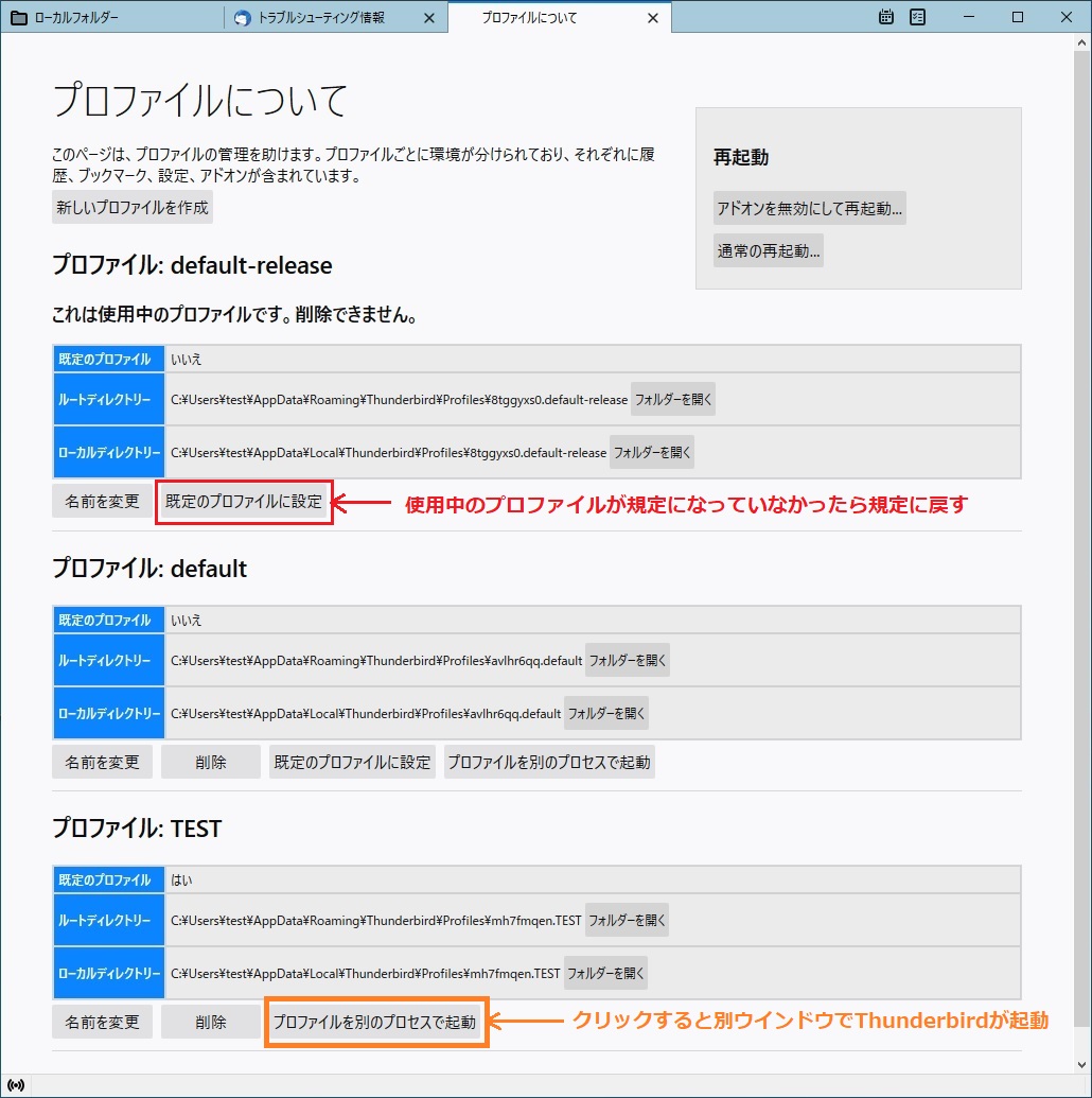 - 動作確認が終わったら、別ウインドウの Thunderbird を閉じてください。元のプロファイルは今まで通り使用できます。