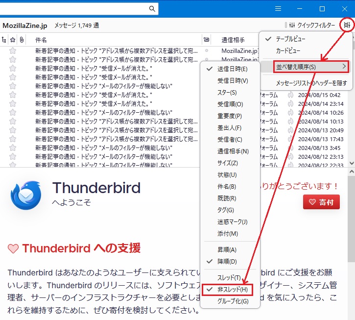 後は「表示」で「並べ替え順序」を「降順」「スレッド」にして