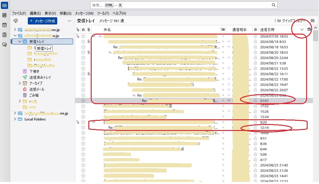 メールを受信日時順にしているのですが、スレッドへの返信について、古いスレッドに含まれた形で受信するため、