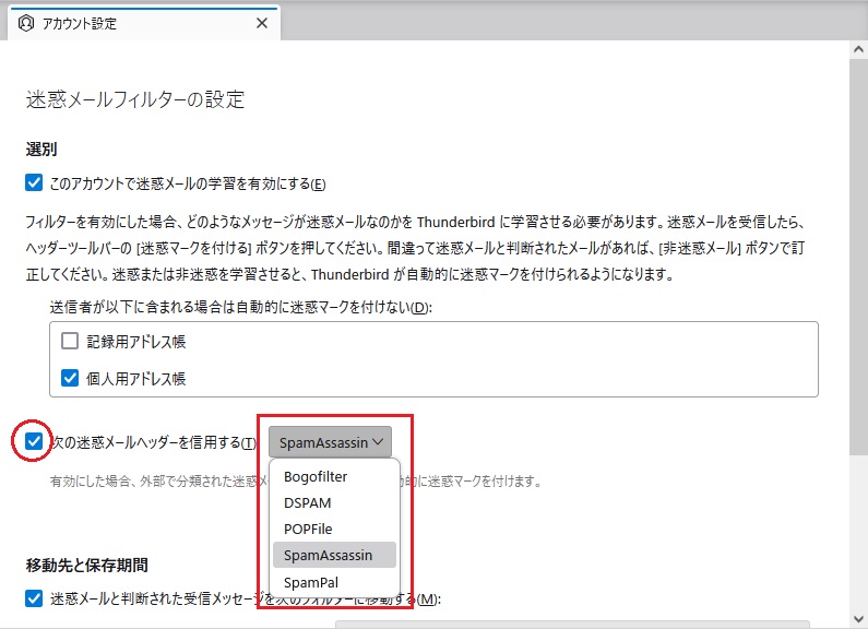 Thunderbirdのアカウント設定の「迷惑メール」には、「次のメールヘッダーを信用する」という項目があり、