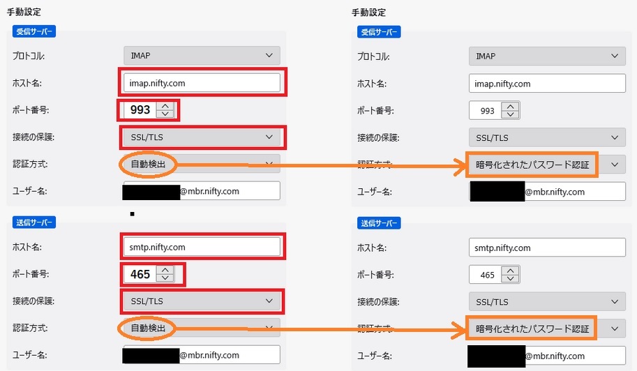 上記ご提示URLのページの設定手順を拝見いたしましたが、受信/送信サーバーの「認証方式」を「自動認証」を選択した態で再テストすると「暗号化されたパスワード認証」になることが画面画像で示されています。