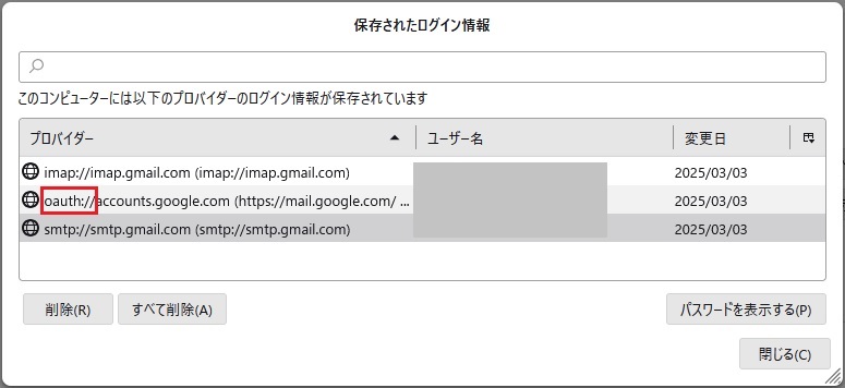 (2) Thunderbird でいったん2段階認証はキャンセルし、設定>プライバシーとセキュリティ>「保存されているパスワード...」にて、該当のGmailのログイン情報のスコープ「oauth」を削除してください。(ついでにimapとsmtpも消してみたほうがいいかも)