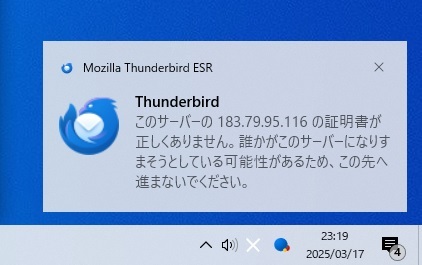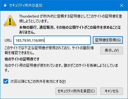 thunderbird この サーバー の 証明 書 が 正しく あり ませ ん 誰かがこのサーバーになりすまそうとしていますと表示されてしまいメールの受信と送信ができません。