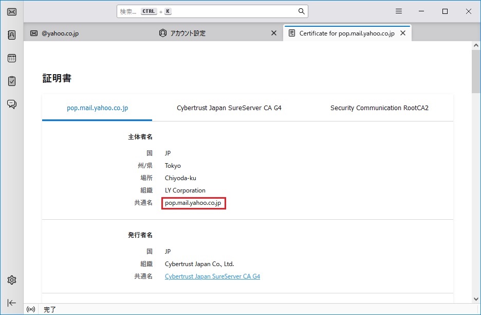 これでサーバーとSSL/TLS通信を接続しようとすると、接続しようとしているサーバーはIPアドレスなのにサーバーから来た証明書には「pop.mail.yahoo.co.jp」と記載されているので一致しない、他のサイトの証明書でなりすまそうとしているとなるわけです。