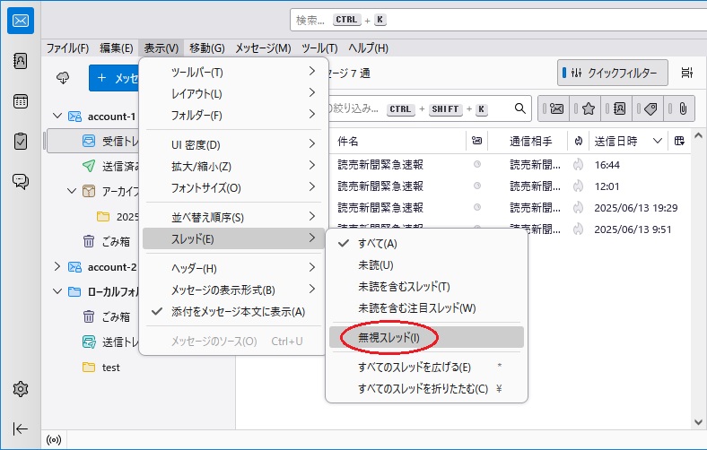 スレッド単位で無視する | Thunderbird ヘルプメニューバーが出ていない場合はAltキーで出してから、