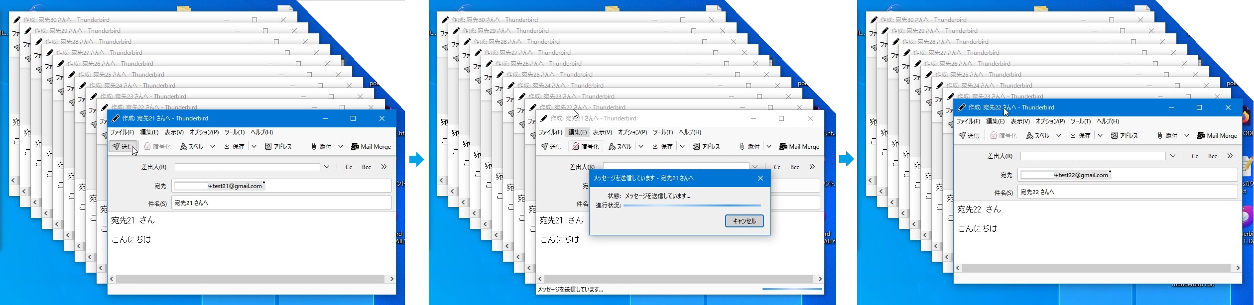 2、下書きを全て開き(30通であり30ウィンドウ)、連続して送信ボタンを押下