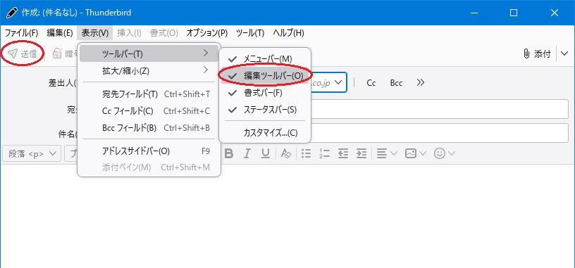 キー操作だと、Alt+V (表示メニューが開く)→ Enter(最初にカーソルがあるツールバーメニューが展開)→ O(編集ツールバー)で編集ツールバーがON/OFFされます。