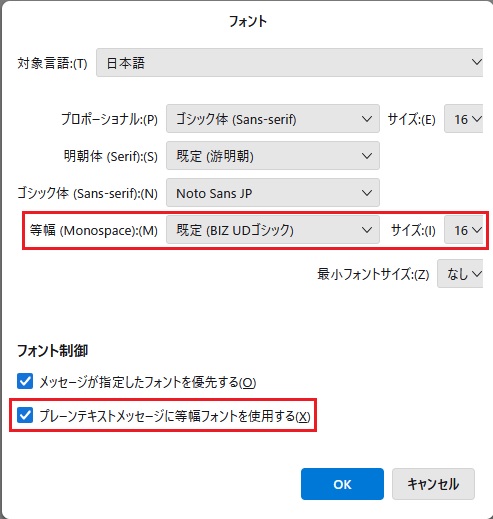 この場合、日本語版のThunderbirdではフォント設定の「対象言語:日本語」の指定が使われることになります。