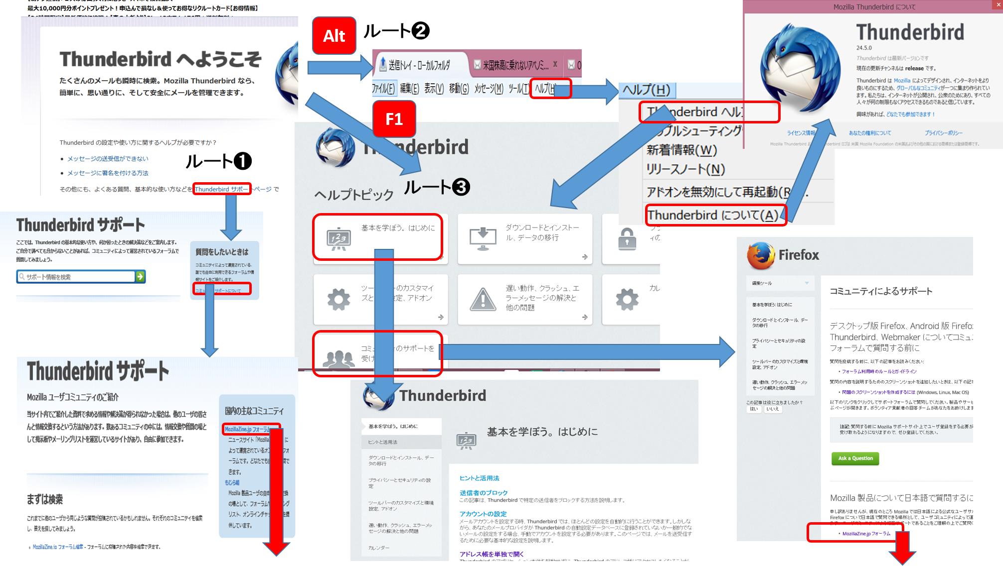 ➋そこでF1キーを押してみたのですが、Mojilla supportには跳びますが、何故かバージョン情報はどこにもありません。そこで「Thunderbirdサポート」に『Thunderbird2サポート終了』と書いてあることと、自分は最新にupdateしていたことの記憶から、質問にTb3であると誤記してしまいました。