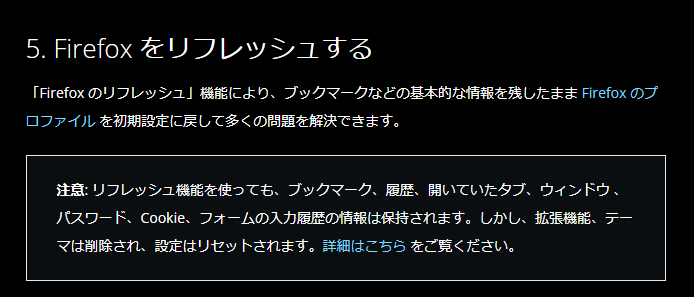 上から順に試し、解決できなければ次の手順に進んでください。なお、「Firefoxをリフレッシュして・・・」もブックマークは消去されません。