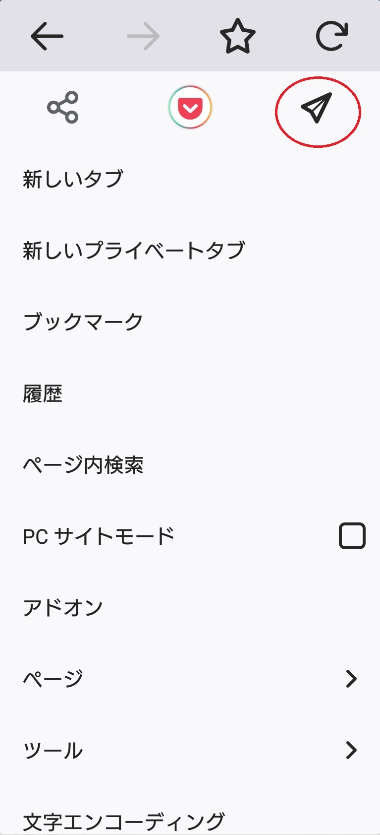 Andoroid版の紙飛行機みたいなボタンはメニューにあります。