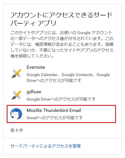 ・アカウントにアクセスできるサードパーティ アプリ:Thunderbirdは表示無し