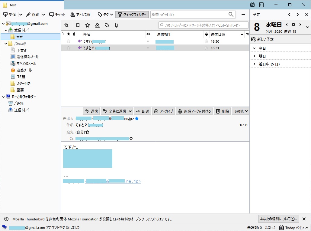 他の PC の Thunderbird の IMAPアカウントで見ると